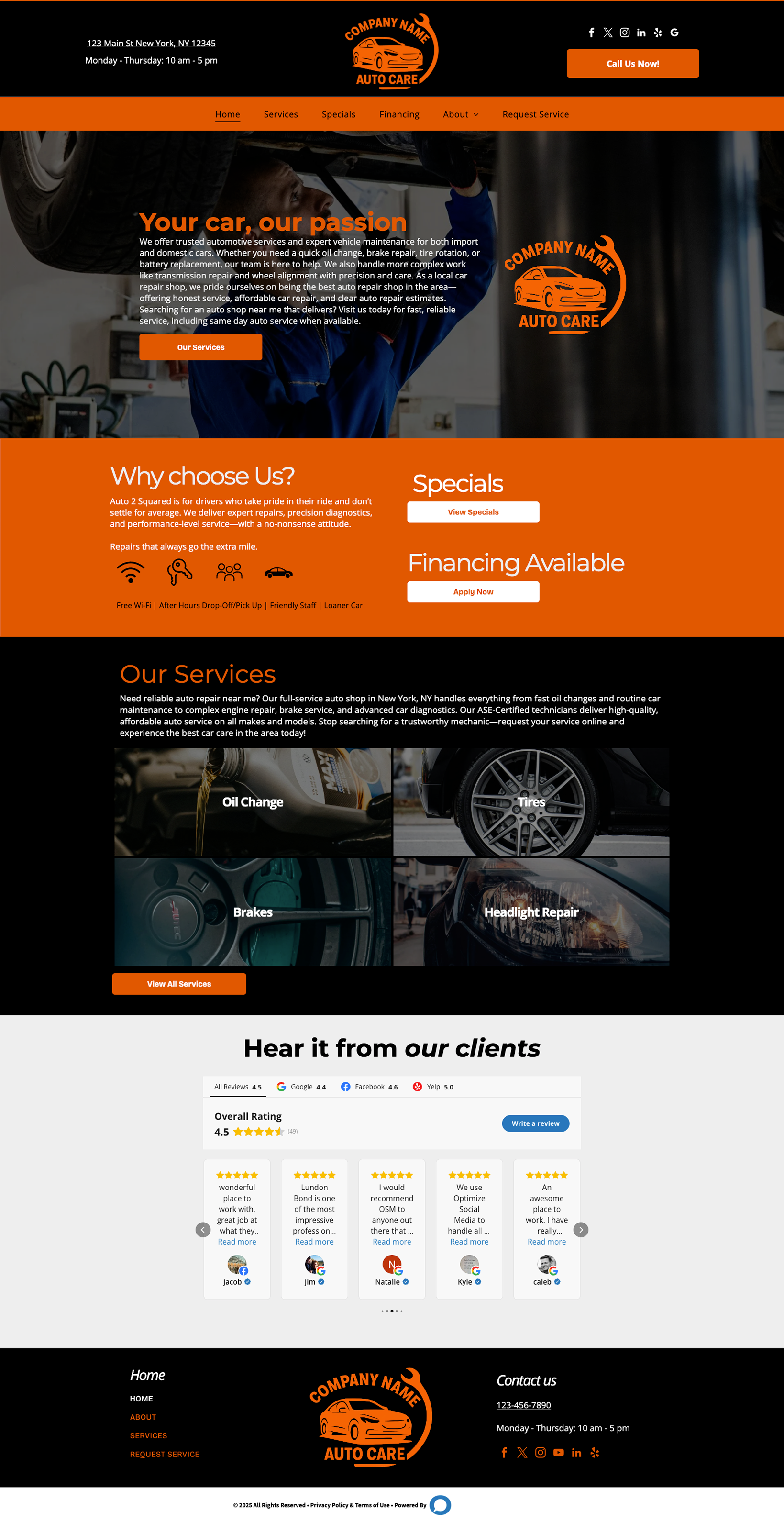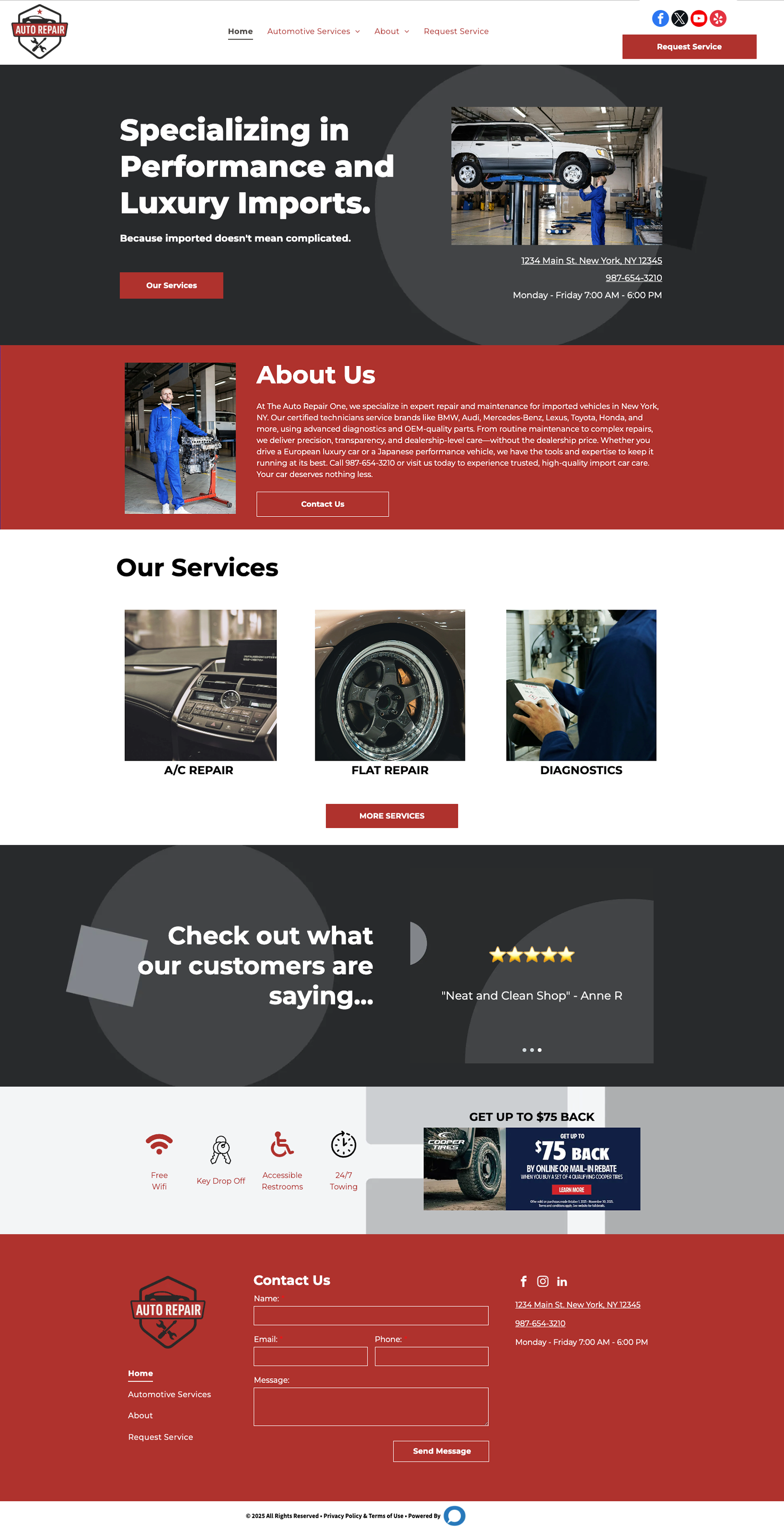 Browse our collection of modern, high-performing website designs built with automotive repair shops in mind. Each layout is crafted to highlight your services, build customer trust, and drive more appointments. From bold, performance-focused styles to clean, local-friendly designs, you’ll find options that look great on any device and make your business stand out online.