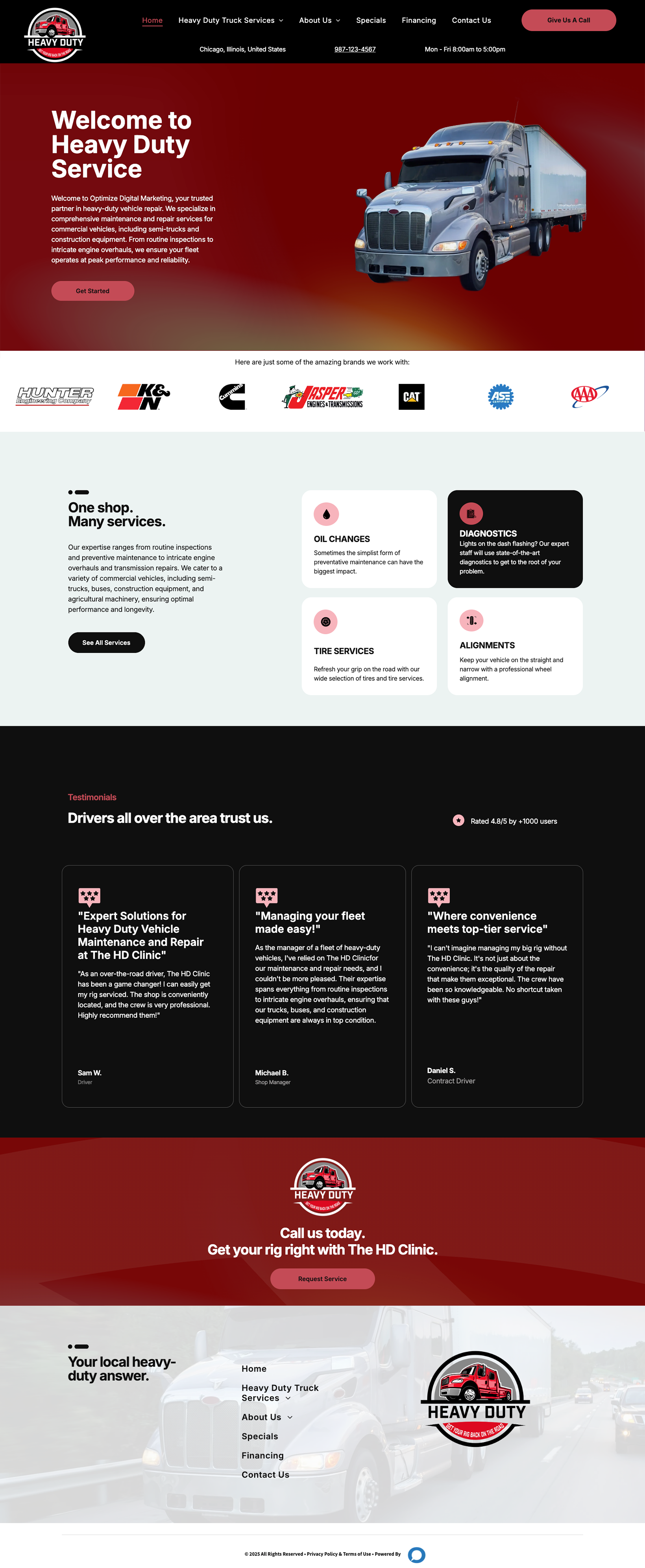 Explore our selection of website designs built for heavy-duty truck service shops. Each layout is designed to highlight your specialized services, showcase your expertise, and make it easy for fleet managers and truck owners to schedule appointments. Responsive and professional, these designs help your business stand out online and drive more customer inquiries.